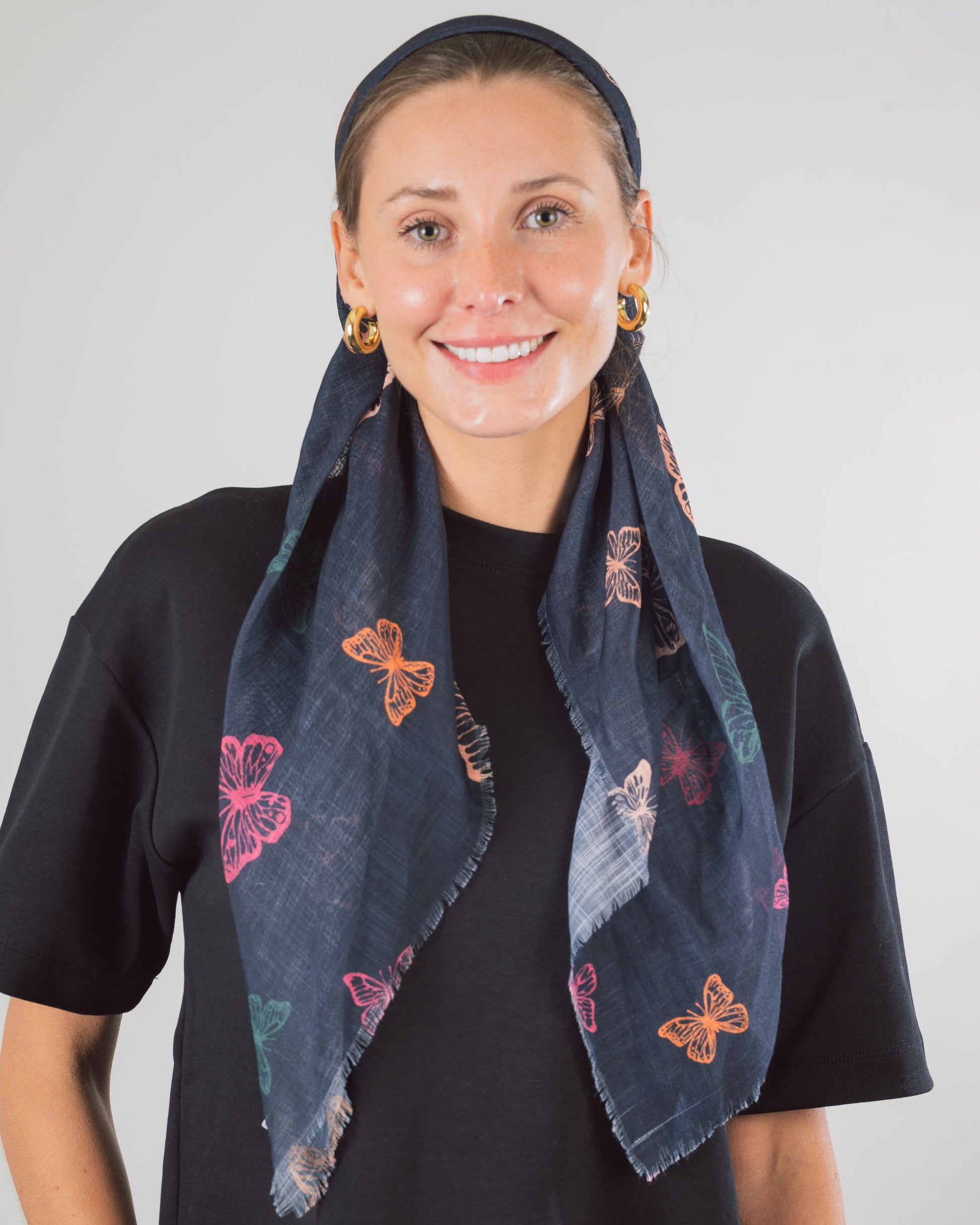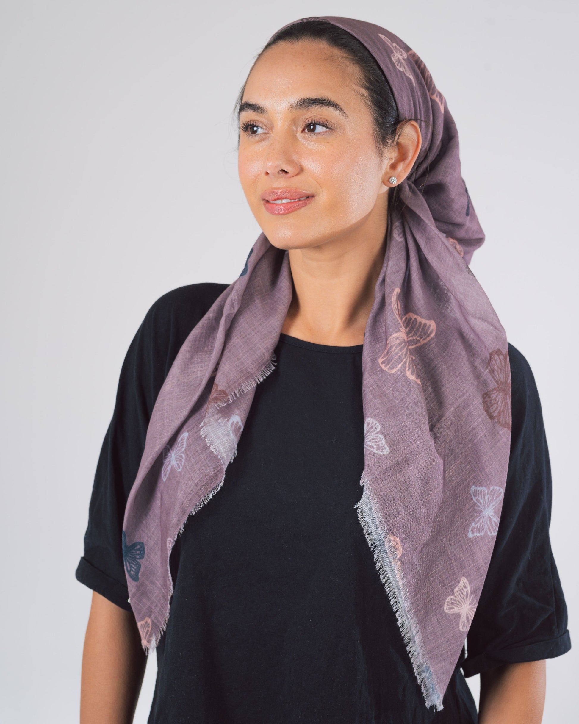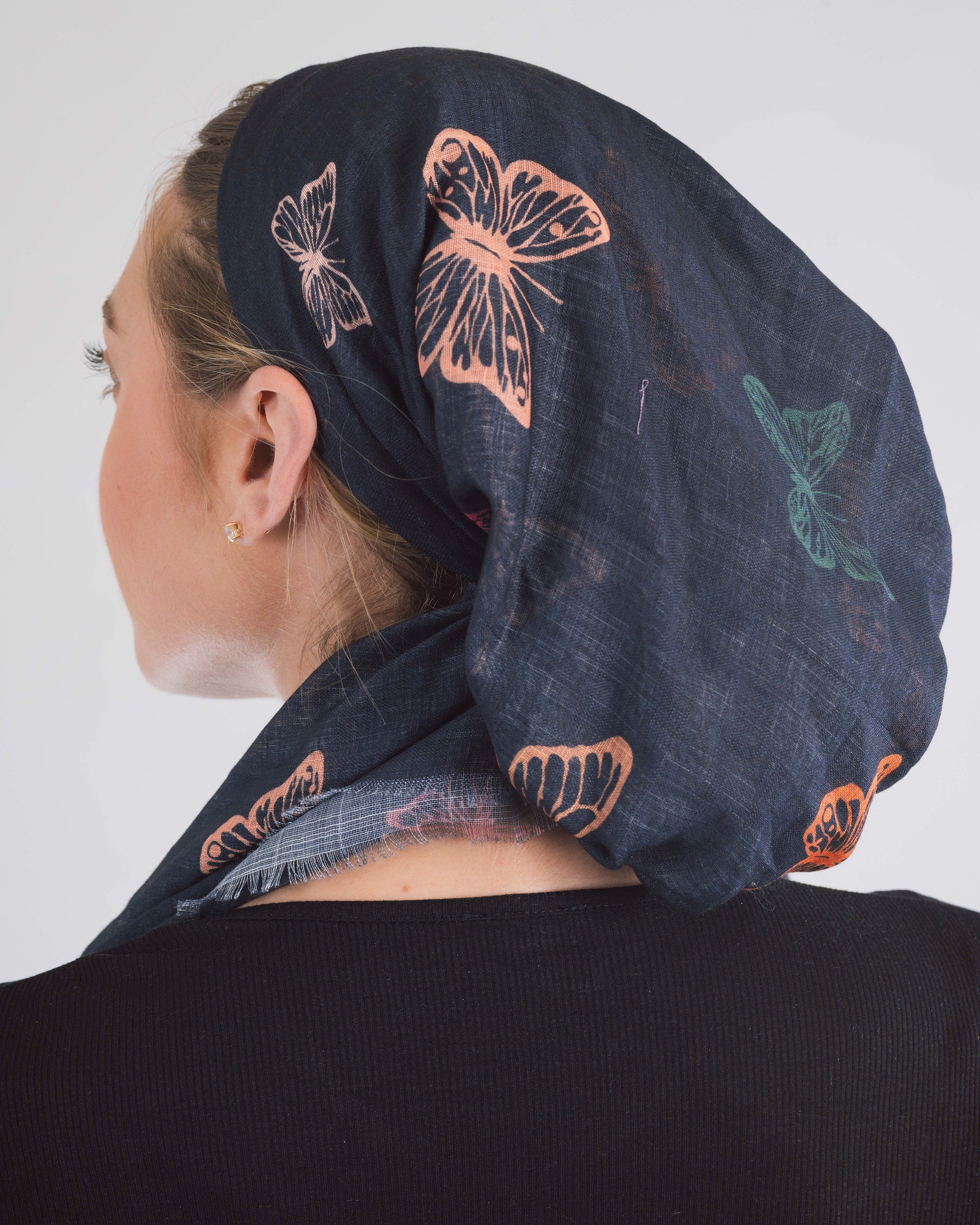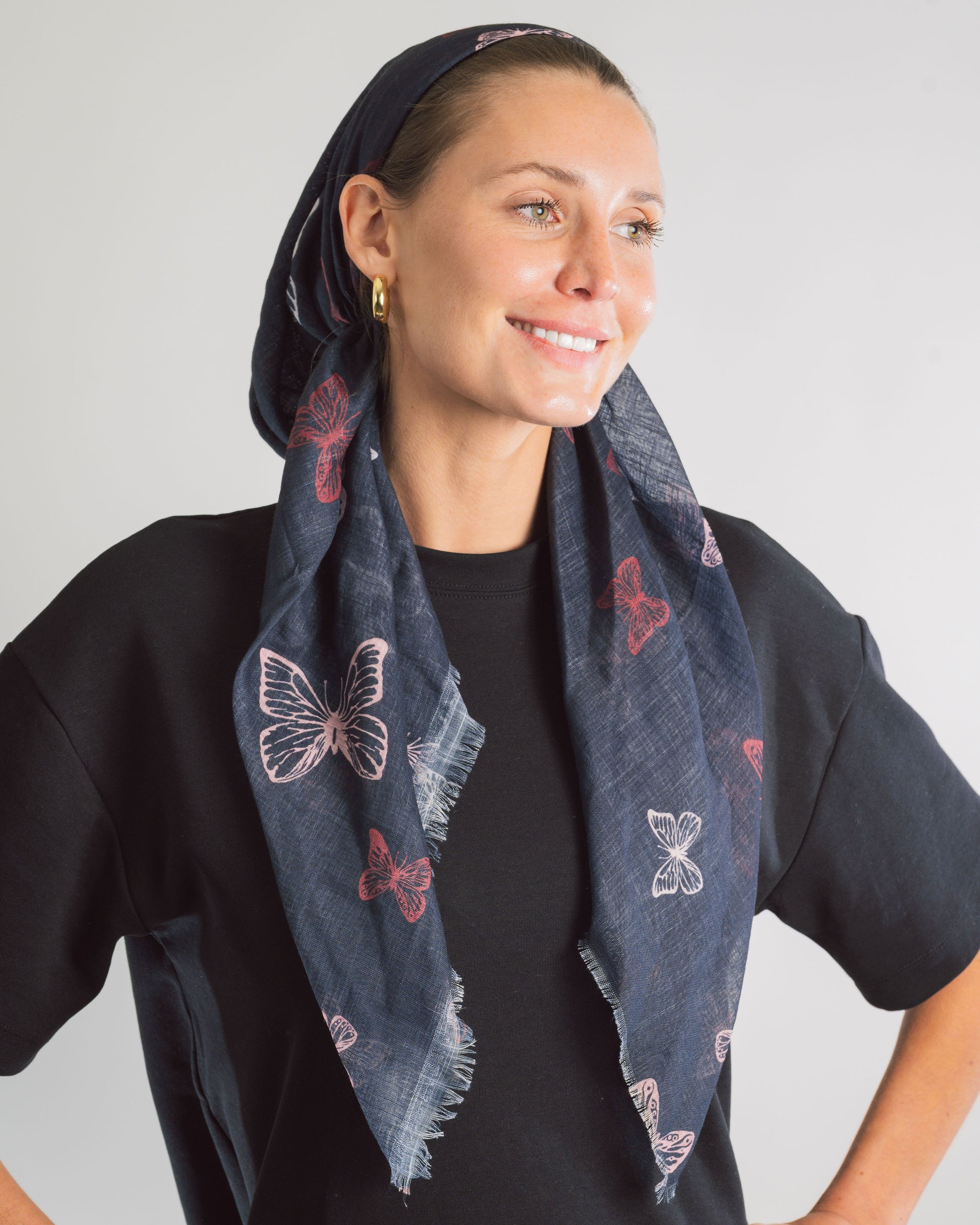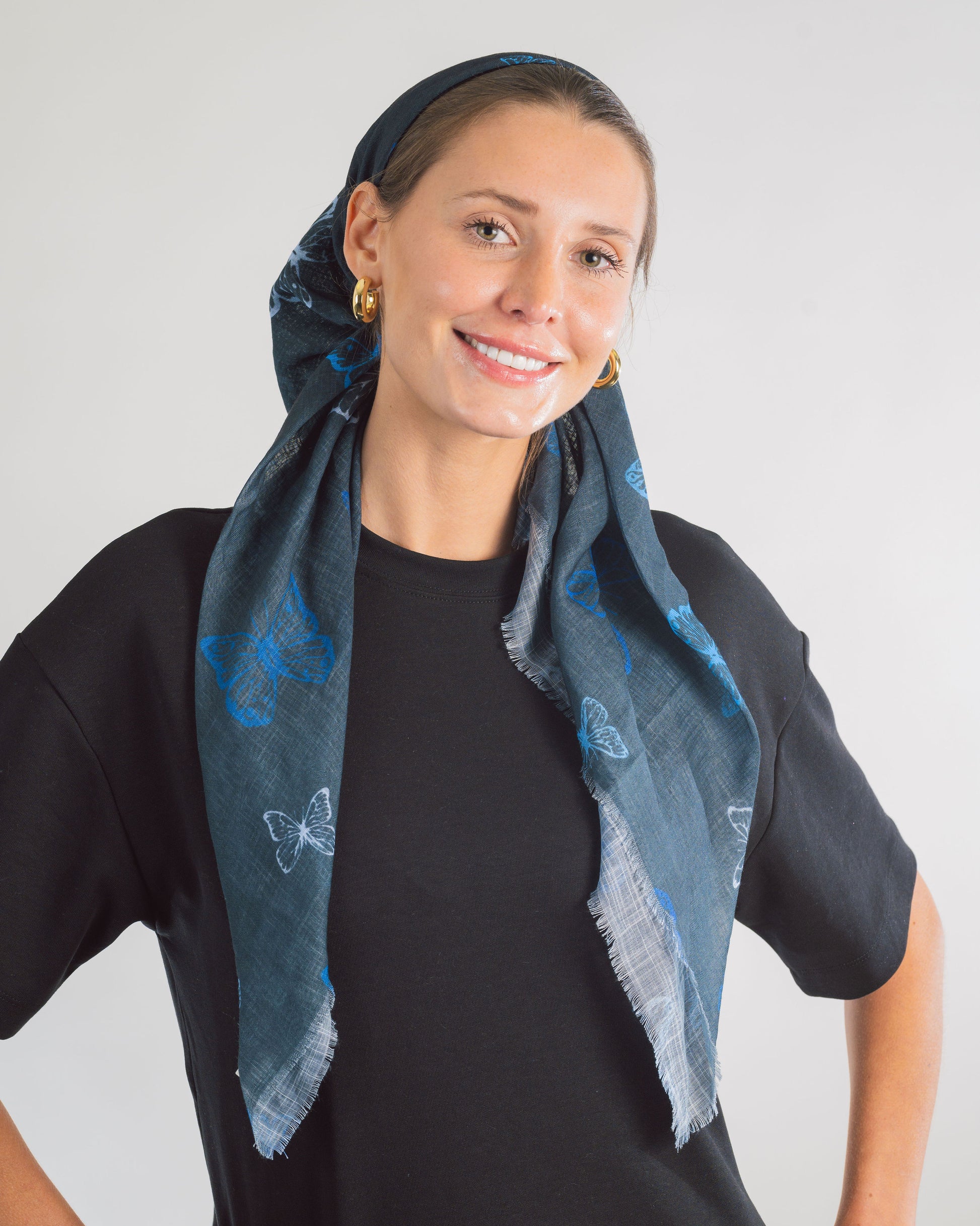 Introducing the "Butterfly Dreams Headscarf" from our Nature's Grace Collection. This enchanting piece features a delicate butterfly print, adding a touch of whimsy and elegance to your wardrobe. The beautifully detailed butterflies flutter gracefully across the fabric, creating a serene and captivating pattern that embodies the beauty of nature.