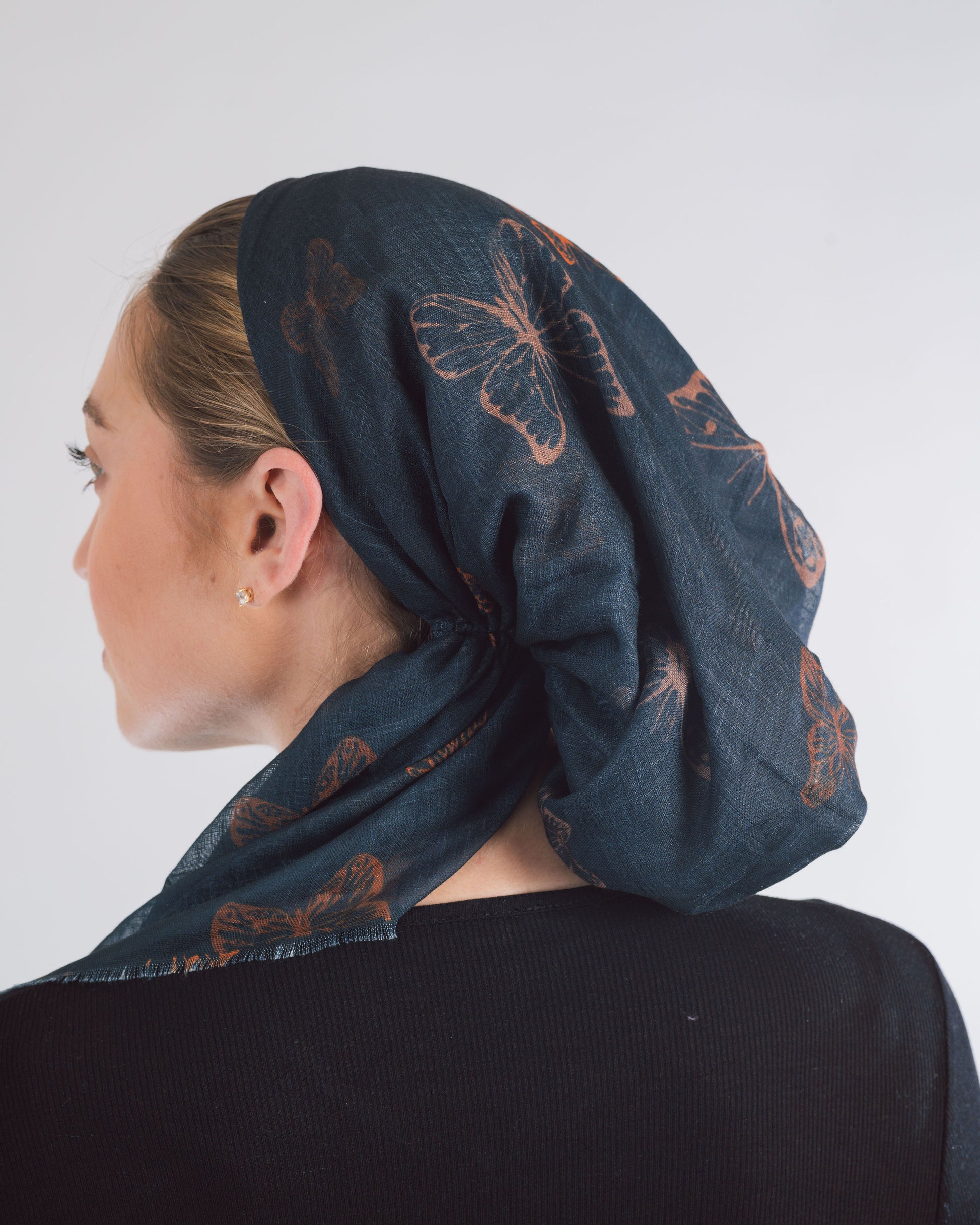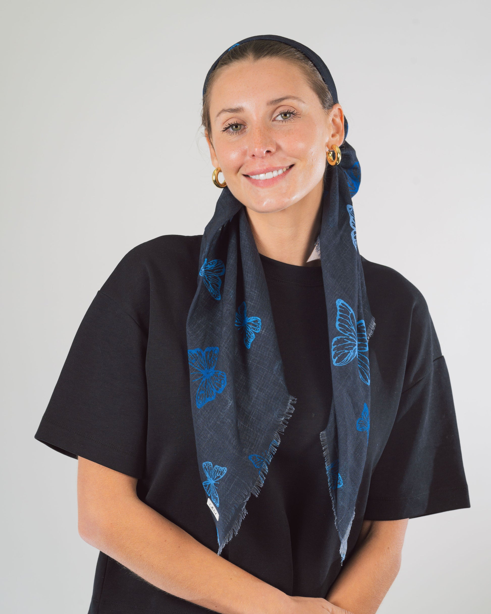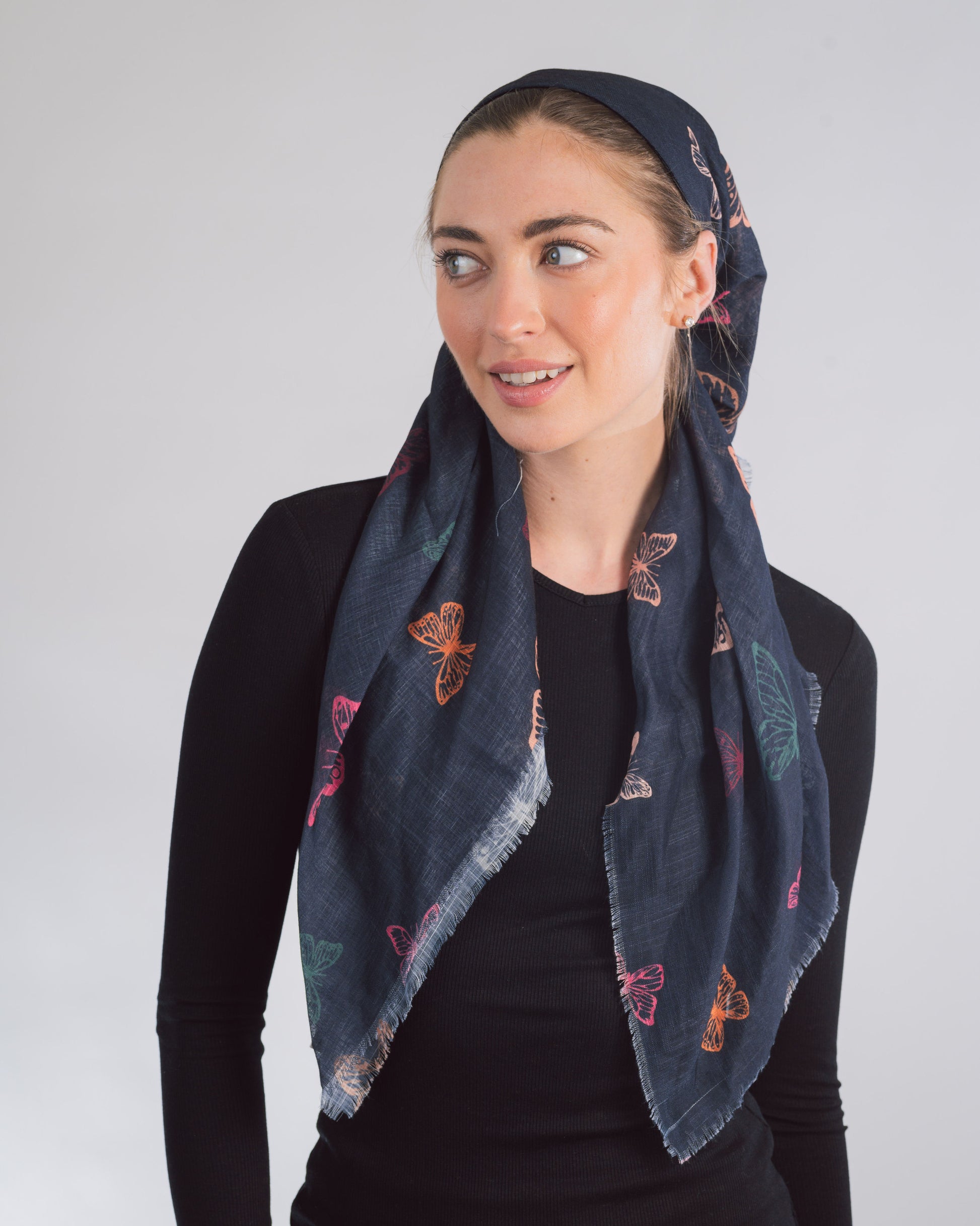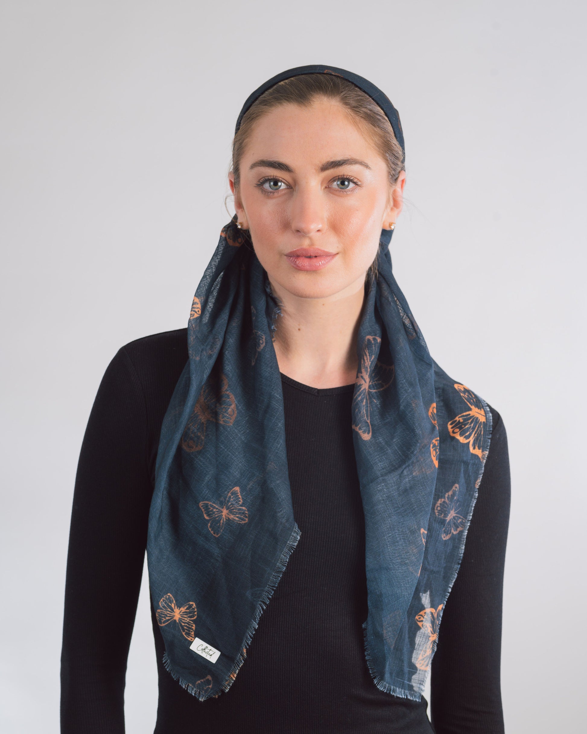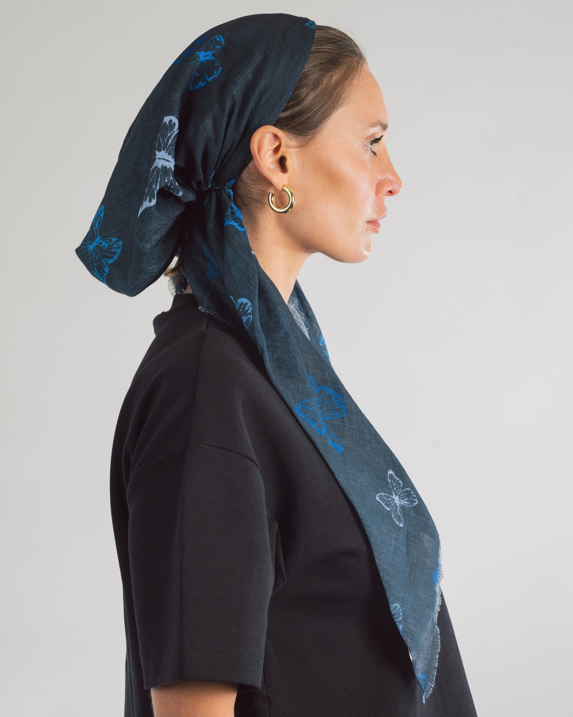 Introducing the "Butterfly Dreams Headscarf" from our Nature's Grace Collection. This enchanting piece features a delicate butterfly print, adding a touch of whimsy and elegance to your wardrobe. The beautifully detailed butterflies flutter gracefully across the fabric, creating a serene and captivating pattern that embodies the beauty of nature.
